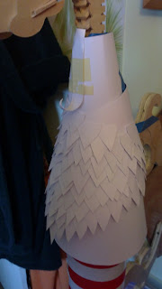 With the top and bottom both finally clad in card I had to decide on a design for the surface detail. I decided that in order to blend the dragon's head into the rest of the piece I would cut little scale-shaped plates out and cover the top half of the upper cap with them, spiralling up to the top. At the bottom I constructed a long spiralling tail. I imagined the two caps would have been constructed from metal, and in the case of the tail and scales, thin pieces of iron had been hammered on. This would give both an ornate and industrial mechanised look to the overall structure, tying in well with the victorian steampunk setting.